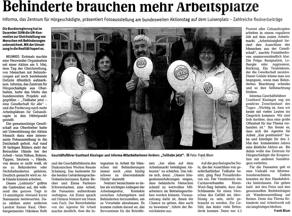 Der Förderverein für Hörgeschädigte e.V. richtete einen Informationstand in der Fußgängerzone in Neuwied aus. Unter dem Motto „Gemeinsame Wege“ informierten Vereinsmitglieder gemeinsam mit Mitarbeitern der Informa Zentrum für Hörgeschädigte gGmbH interessierte Passanten über Barrierefreiheit und Inklusion, insbesondere bei Hörbehinderung und über Kommunikation mit hörgeschädigten Menschen.